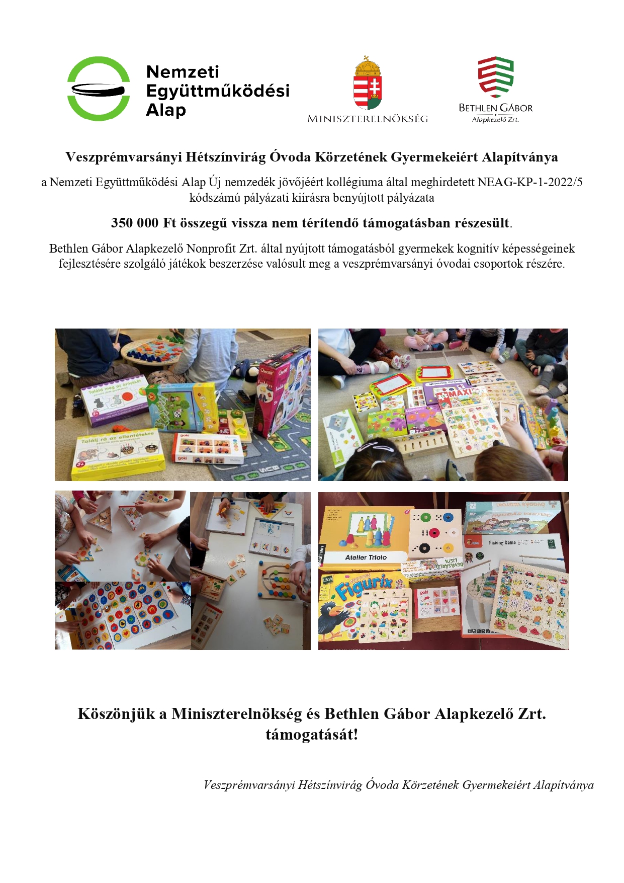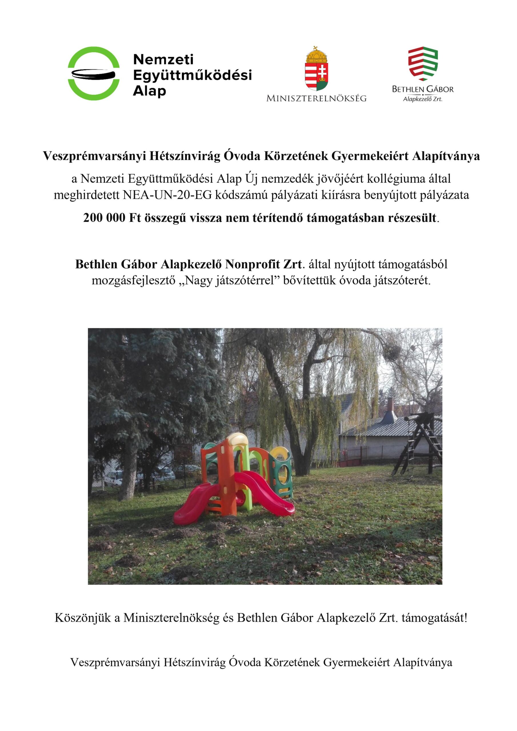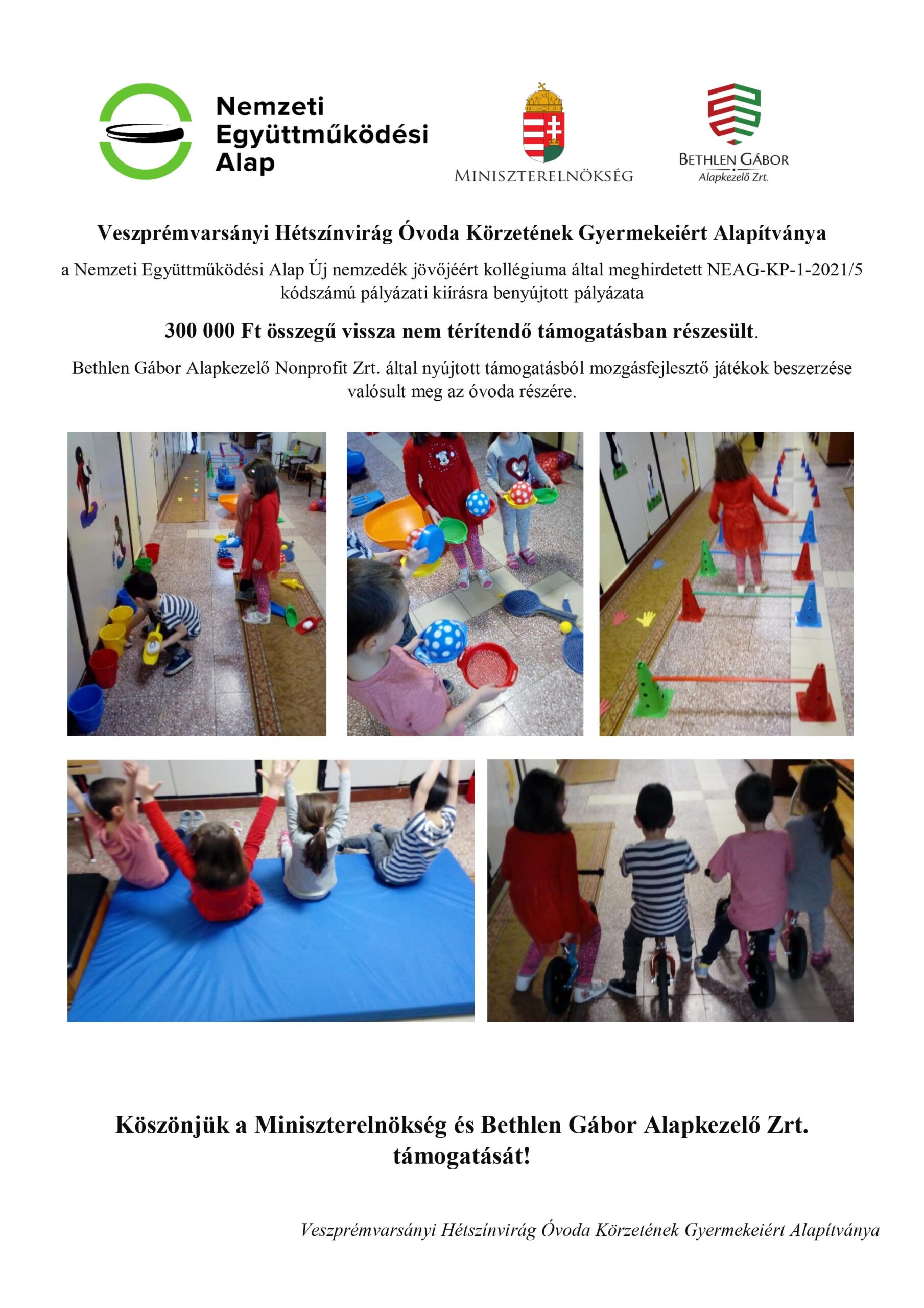 Kérjük, hogy adója 1%-át a Veszprémvarsányi Hétszínvirág Óvoda Körzetének Gyermekeiért Alapítvány számára ajánlja fel! A befolyt összeget játékokra, kirándulásokra az óvodával kapcsolatos fejlesztésekre fordítjuk!